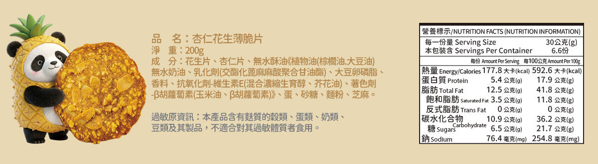挑戰極致的酥脆口感,將杏仁的優雅清香與花生的濃郁醇厚完美結合。這款杏仁花生薄脆片,嚴選飽滿杏仁片與在地花生,均勻鋪灑在薄如蟬翼的餅體上,經慢火烘焙逼出堅果天然的油脂香氣。